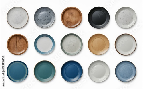 Stylish Dinnerware Collection: A curated array of plates in various colors, materials, and finishes. Perfect for showcasing your restaurant's offerings or home decor.
