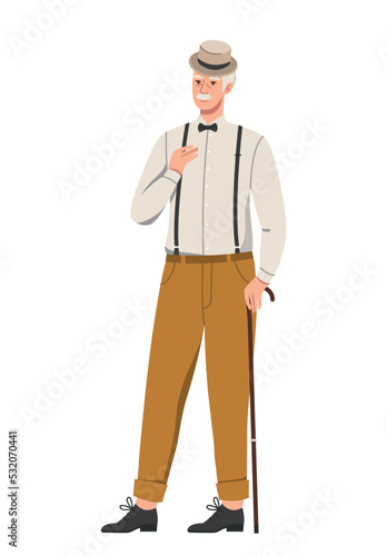 Stylish elderly person. Fashionable old man in elegant shirt, hat and trousers with suspenders holds cane. Happy Grandfather in trendy outfit. Cartoon flat vector illustration on white background