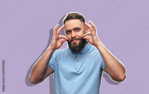 Stylish handsome bearded man looking at camera. Collage in magazine style.