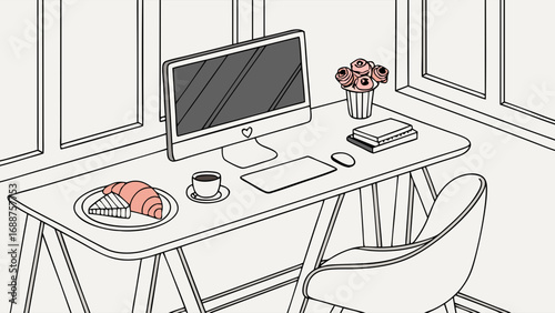 Stylish Home Office Desk Setup with Computer Flowers and Breakfast.