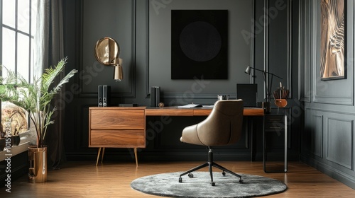 Stylish home office setup with a chair, desk, commode, black mock-up poster, and elegant accessories, perfect space for a modern work atmosphere