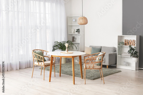Stylish interior of spacious living room with table, armchairs, sofa, houseplants and shelving unit