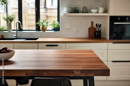 Stylish Kitchen with Modern Wooden Tabletop and Blurred Background for Elegant Home Decor
