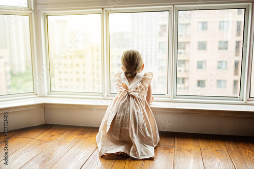 Stylish little girl with blonde hair sitting at home near window during coronavirus covid-19 self isolation