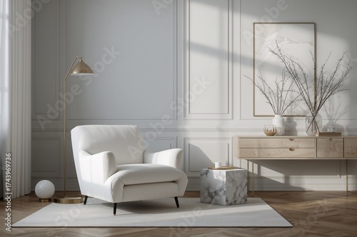 Stylish living area featuring a white boucle chair, marble side table, golden lighting, ladder shelf, decorative items, and personal touches. Simple home styling.