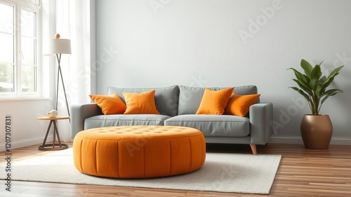 Stylish living room with light gray couch, orange pillows, round blue ottoman, natural light, round ottoman, blue, pop of color