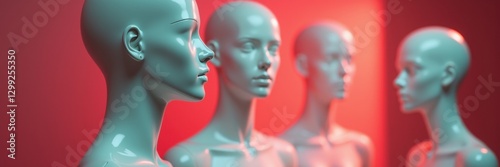 Stylish mannequins in striking teal against a vibrant red background, perfect for showcasing fashion and retail concepts.