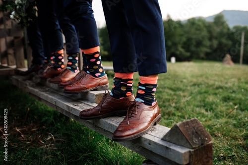 stylish men's socks. Stylish suitcase, men's legs, multicolored socks and new shoes. Concept of style, fashion, beauty and vacation