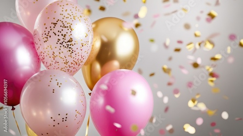 Stylish metallic pink and gold balloons adorned with confetti creating a romantic and festive atmosphere for various celebrations