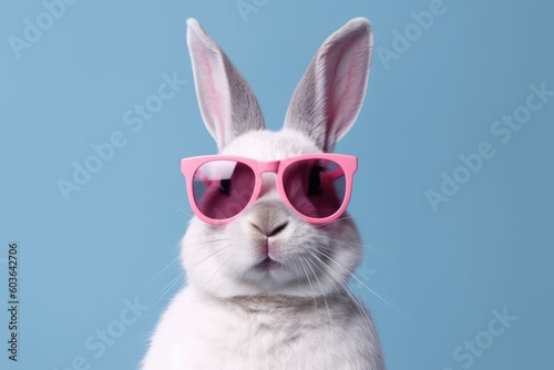 Stylish portrait of dressed up anthropomorphic bunny wearing pink glasses on vibrant blue background with copy space. Funny pop art animal illustration. AI generative image.