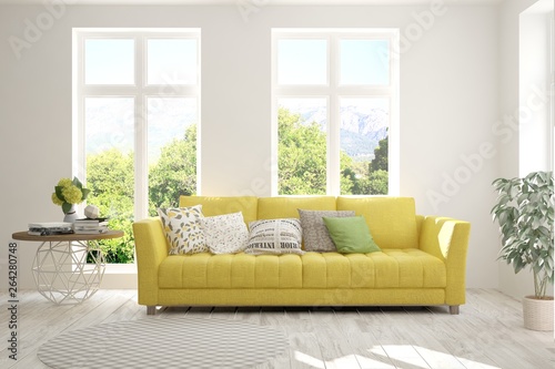Stylish room in white color with sofa and summer landscape in window. Scandinavian interior design. 3D illustration