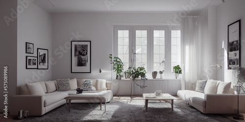 Stylish scandinavian living room with design mint sofa, furnitures, mock up poster map, plants and elegant personal accessories. Modern home decor. Bright and sunny room. Generative AI illustration.