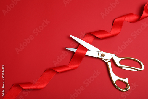 Stylish scissors and red ribbon on color background, flat lay with space for text. Ceremonial tape cutting