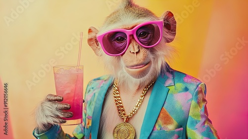 Stylish Sophisticated Monkey: A Vibrant Poster for Sports Interiors Featuring a White-Furred Monkey in a Multicolored Suit Enjoying a Pink Cocktail Against an Abstract Colorful Background!