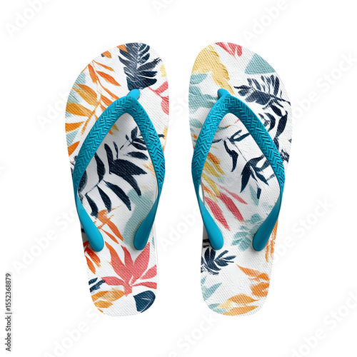 Stylish summer footwear displays a pair of patterned flip-flops with teal straps and a bright tropical leaf design, perfect for vacation.