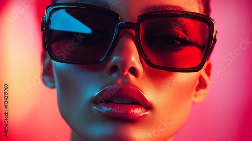 Stylish woman wearing colorful reflective sunglasses