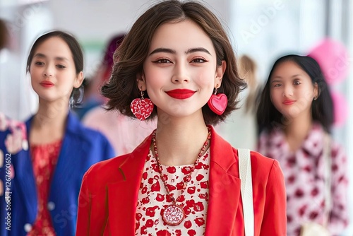 Stylish Young Woman in Red Blazer with Heart-Shaped Earrings