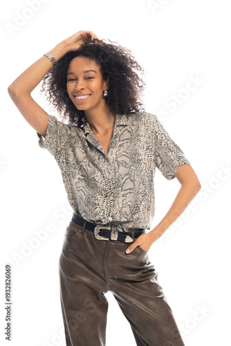 Stylish young woman radiates confidence with her vibrant fashion choices in a bright setting