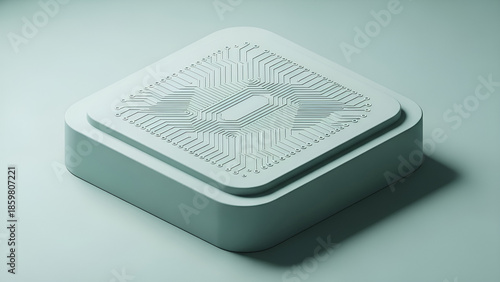 Stylized 3D render of a minimalist integrated circuit in soft teal.