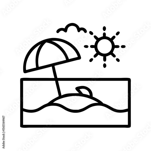 Stylized beach scene icon with umbrella, sun and ocean waves