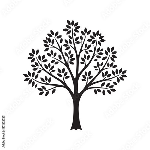 Stylized Black Tree Silhouette with Individual Leaves and Symmetrical Branches