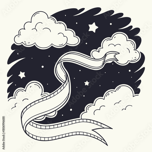 Stylized Clouds and Ribbon Banner in a Starry Night Sky stars