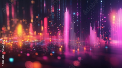Stylized D bar graph with bars of varying heights, each one glowing against a dark background, creating a high-impact visual for data analysis