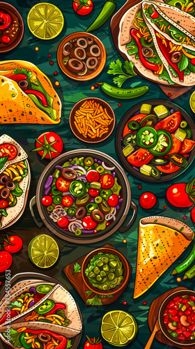 Stylized depictions of delicious Mexican cuisine, mobile phone wallpaper