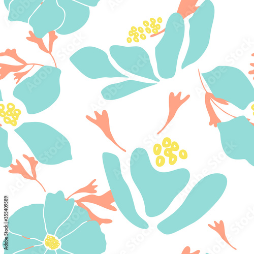 Stylized flowers hand drawn color vector seamless pattern. Abstract poppies or roses with leaves, sketch drawing. Scandinavian style cartoon floral texture. Wrapping paper, textile, background fill