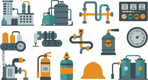 Stylized Industrial Illustration Factory, Pipes, Gauges, Fire Extinguisher and Safety Equipment Icons