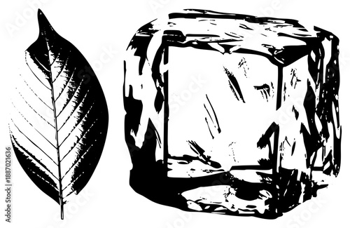 Stylized Leaf and Ice Cube Vector Illustration in Bold Black and White