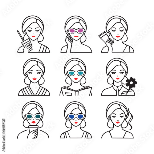 Stylized line art illustrations of women with red lips and colorful sunglasses woman drawing