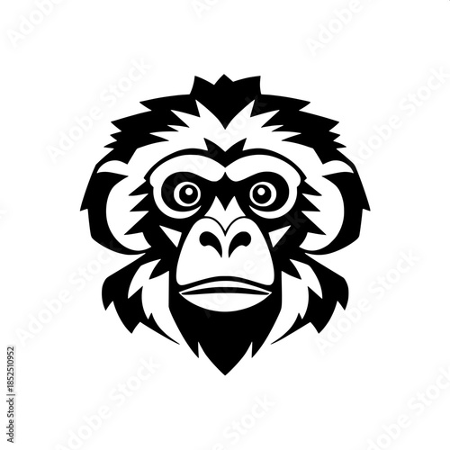 Stylized primate face logo in black and white, with prominent strong brow ridges, alert eyes that are rounded and expressive, simplified fur shapes that are geometric and abstract, emphasis on negativ