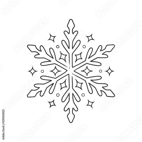 Stylized snowflake vector with decorative edges and sparkles in clean black and white line art style