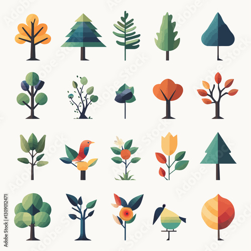 Stylized Trees, Birds, and Flowers Illustration, Nature Elements
