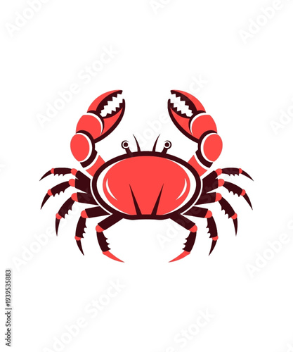 Stylized vector graphic illustration of a vibrant red and dark crab with prominent claws and legs