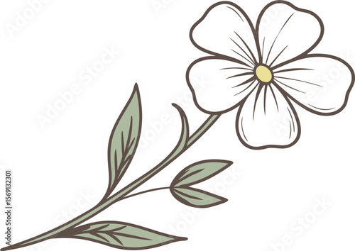 Stylized Vector Single White Flower Pale Green Leaves Brown Stem Botanical Line Art Floral Design Element