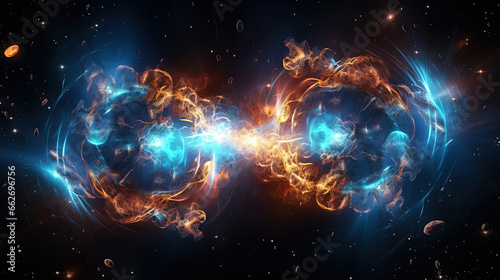 Subatomic proton particle collision. Nuclear fusion concept. Generative AI