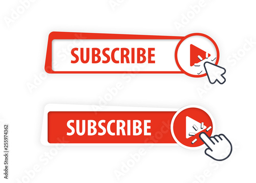 Subscribe button icon with hand pointer and arrow clicking. Vector Button Design illustration.