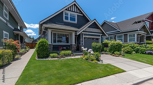 Suburban home on sunny day with green lawn