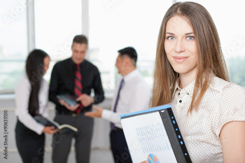 Successful business woman at foreground and business team at background