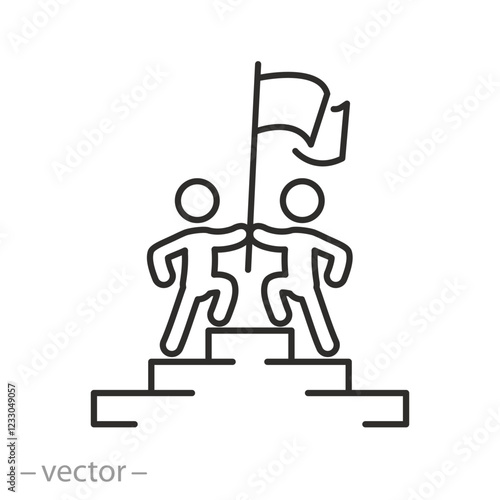 successful community icon, success in achieving the goal, people with flag standing on top of mountain, thin line symbol on white background - editable stroke vector illustration