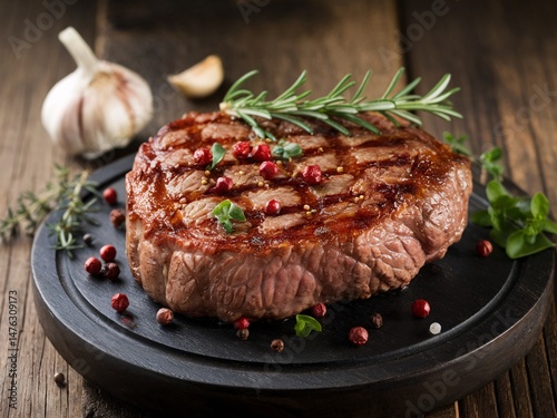 Succulent grilled steak garnished with herbs and spices on a rustic wooden table.