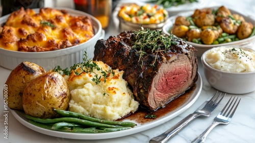 Succulent roast beef served with creamy mashed potatoes, green beans, and a rich gravy sauce, garnished with fresh herbs.