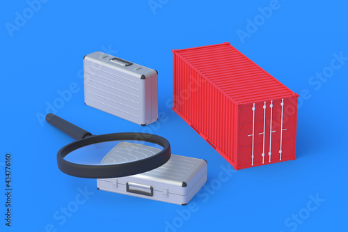 Suitcases near standardized container and magnifier. Search for investors, investments for a transport company. Examination of accompanying documents at customs. Cargo check. 3d render