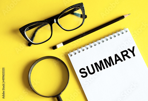 SUMMARY text written on a notebook with glasses, magnifying glass and pencil