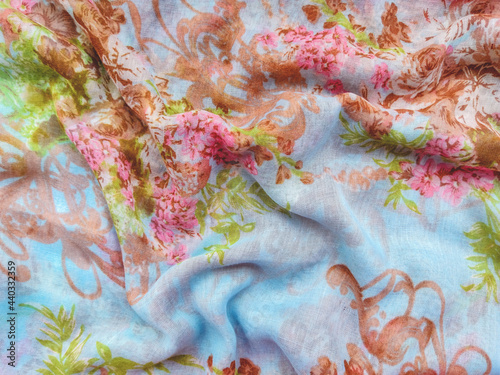 summer bright juicy colorful background floral textile light fabric cotton with white round pearls and an empty place for an inscription for a girl women congratulation for cosmet