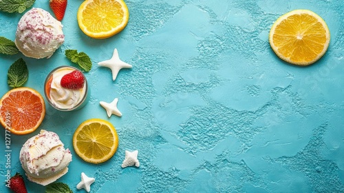 Summer Citrus Dessert Delight Creamy Ice Cream, Fresh Fruit, and Cool Mint on a Blue Background