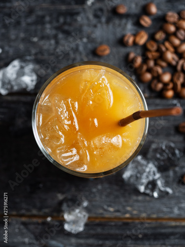 Summer drink iced coffee in a glass on a dark old wooden table with coffee beans