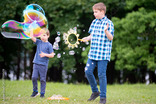 Summer holidays. Schools out. Two brothers playing with soap bubbles in the park. Cheerful happy family having a picnic. Vacations and trips out of town in nature.